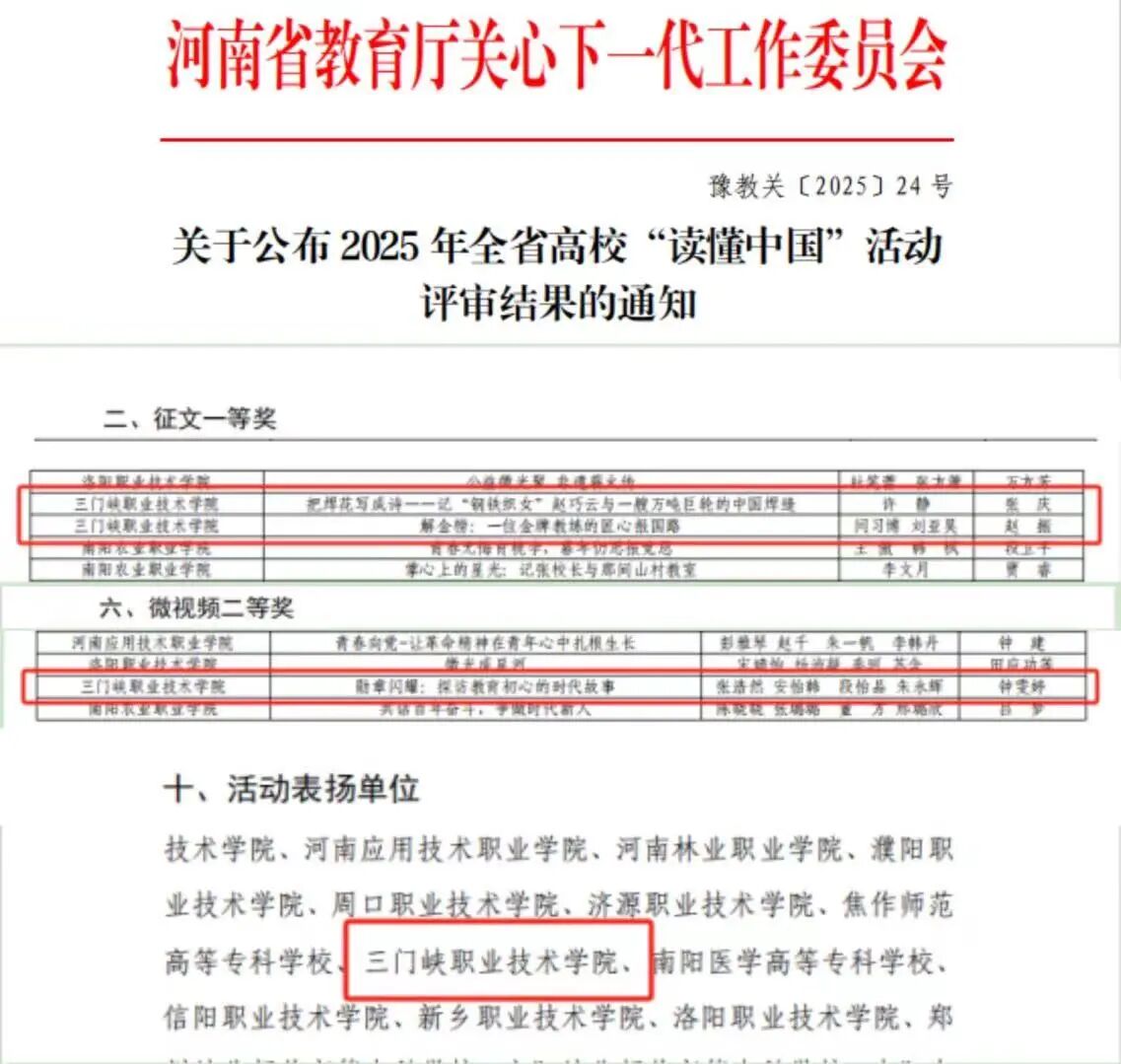 近日,河南省教育厅关心下一代工作委员会公布2025年“读懂中国”活动评审结果。学院师生凭借深厚的人文素养、创新的创作思路与真挚的家国情怀,在征文、微视频赛道中斩获一等奖2项、二等奖1项,充分展现出学院依托“大思政课”实践育人平台,推动思想政治教育走深走实的扎实成效。