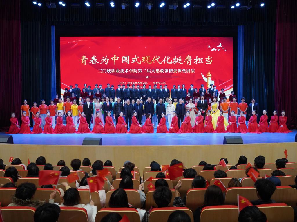 为深入学习贯彻党的二十届四中全会精神,全面落实习近平总书记关于思政课建设的重要指示批示精神,进一步巩固和拓展学院“大思政课”建设成果,12月25日晚,学院在学术报告厅举行“三门峡职业技术学院第二届大思政情景课堂展演”活动。活动融合情景剧、朗诵、诗乐舞等多种艺术形式,情景再现“十四五”时期辉煌成就,豪情展望“十五五”壮阔蓝图,为广大师生上了一堂鲜活生动的“大思政课”。党委书记杨彤及学院领导班子成员出席展演活动,各院部党政负责人、全体思政课教师及1000余名师生代表观看了展演。