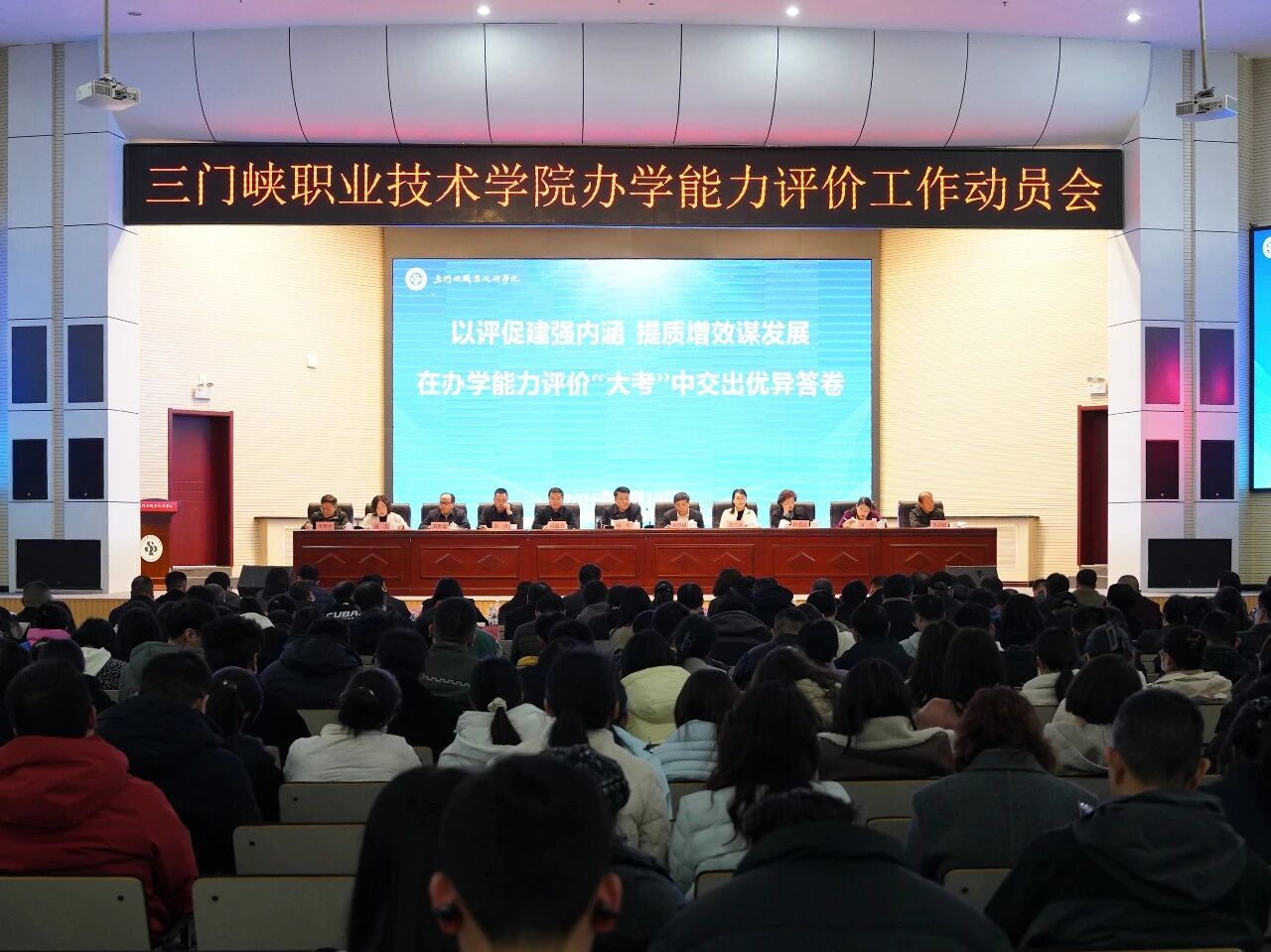 在动员部署阶段,党委书记杨彤以《以评促建强内涵 提质增效谋发展 在办学能力评价“大考”中交出优异答卷》为题作动员讲话。他从战略和全局高度,深刻阐释了开展办学能力评价的重要性,并围绕如何做好迎评促建工作,从四个方面提出明确要求。一是提高站位,深刻认识评价的“生命线”意义。强调评价是落实国家战略的“政治仗”,关系区域发展的“生存线”,回应师生期盼的“奠基战”,决胜升本目标的“关键棋”,全院上下必须以“二次创业”的决心,全力以赴投入迎评工作。二是精准对标,准确把握评价的“坐标系”要求。要逐条研读指标内涵,全面摸排家底短板,凝练产教融合、校企合作等办学亮点,将评价工作与日常教学、内涵建设深度融合,实现协同推进。三是全员攻坚,坚决扛起“主力军”责任。领导干部要挺膺担当当好“领战者”,职能部门要协同发力当好“保障队”,二级学院要守土尽责当好“作战部”,全体教师要深耕课堂当好“排头兵”,形成人人参与、人人有责、人人尽责的强大合力。四是以评促建,奋力谱写高质量发展“新篇章”。要在产教融合上实现新突破,在专业、课程、教材、教师、实训等关键要素改革上取得新成效,在治理能力上实现新提升,在服务区域发展上展现新作为,真正把评价压力转化为发展动力。
