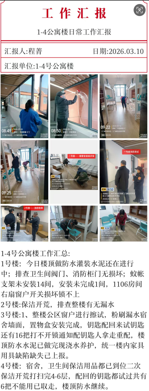 各公寓完成门窗锁具、生活服务设施、消防设施、网络系统及水电线路全面排查,确保设备运行安全有效;对公寓全域实施深度清洁与专业消杀,打造健康舒适环境;有序推进学生返宿登记,强化日常巡查与快速响应机制,全力营造安全有序、温馨宜居的住宿空间。