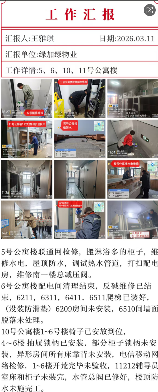 聚焦重点区域,联合电业局开展电力专项巡查,完成配电箱细致检查与供水设备修缮提质,筑牢水电安全防线;全面巡查检修公共场所水电暖设施设备,维修中心24小时待命,应急抢修各类突发事件,为师生学习生活提供坚实可靠的水电保障。
