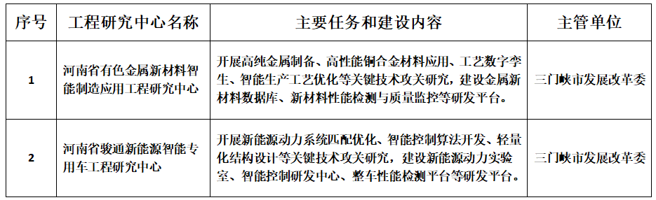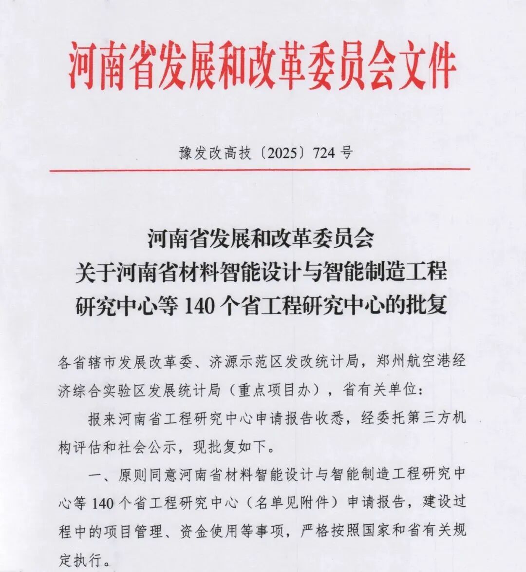 近日,河南省发展和改革委员会发布《河南省发展和改革委员会关于河南省材料智能设计与智能制造工程研究中心等 140个省工程研究中心的批复》〔豫发改高技(2025)724号〕,我院申报的“河南省有色金属新材料智能制造应用工程研究中心”,汽车学院参与申报的“河南省骏通新能源智能专用车工程研究中心”成功获批,实现我院在“双高”建设中省级工程研究中心新的突破,标志着学院在新材料与智能制造领域科研平台建设迈上新台阶。